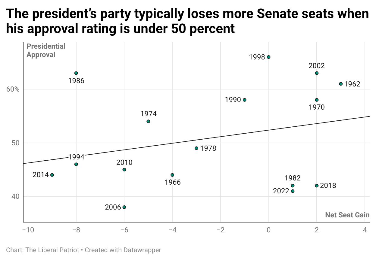 However, there is also reason for caution. For starters, even if we round the average 3.6-seat loss in the chart up to four seats—the number Democrats need for a majority—it’s still an estimate from the past, not a guarantee of what will happen this year. The bottom-right corner of the chart offers another complication. In each of the last two midterm elections, the incumbent president’s approval rating sat in the low 40s, and yet their party saw a net gain in Senate seats: two for Republicans in 2018 under Trump and one for Democrats in 2022 under Biden. This is a good reminder that it also matters which specific seats are up for election.