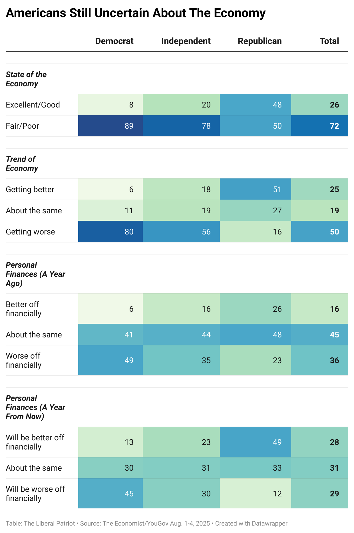 Even with a full-scale change in political leadership following the 2024 election, Americans remain deeply pessimistic about the U.S. economy, according to extensive new data from The Economist/YouGov conducted in early August. More than seven in ten U.S. adults rate the current state of the U.S. economy as either fair or poor, with around one quarter saying the economy is either good or excellent. Although partisanship still determines relative economic sentiments, less than half of self-identified Republicans rate the economy as either good or excellent, with nearly nine in ten Democrats and eight in ten independents holding a dimmer view (see table below).