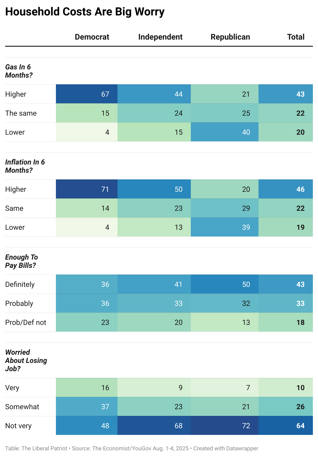 What do these findings tell us in political terms? Like President Biden before him, President Trump and his administration have not yet shown or convinced most Americans (even many of their own partisan voters) that they have a grip on the overall economy and rising costs. Only 40 percent of adults approve of Trump’s handling of jobs and the economy seven months into his second term, with less than three in ten independents approving of his economic stewardship. Trump’s job approval on inflation and prices is even lower at 34 percent.