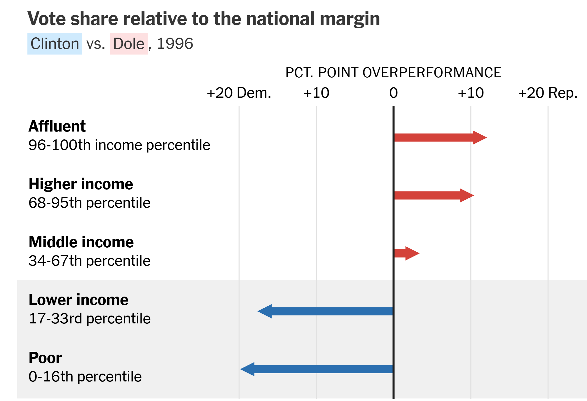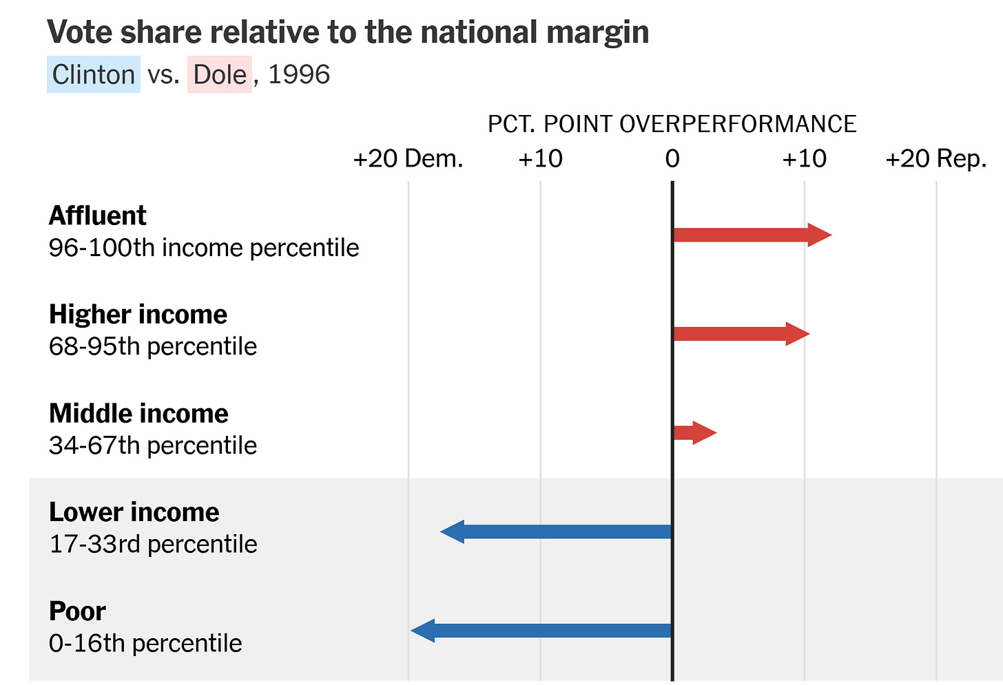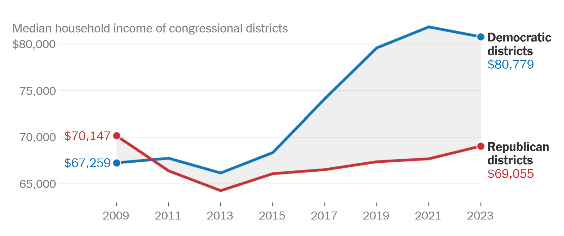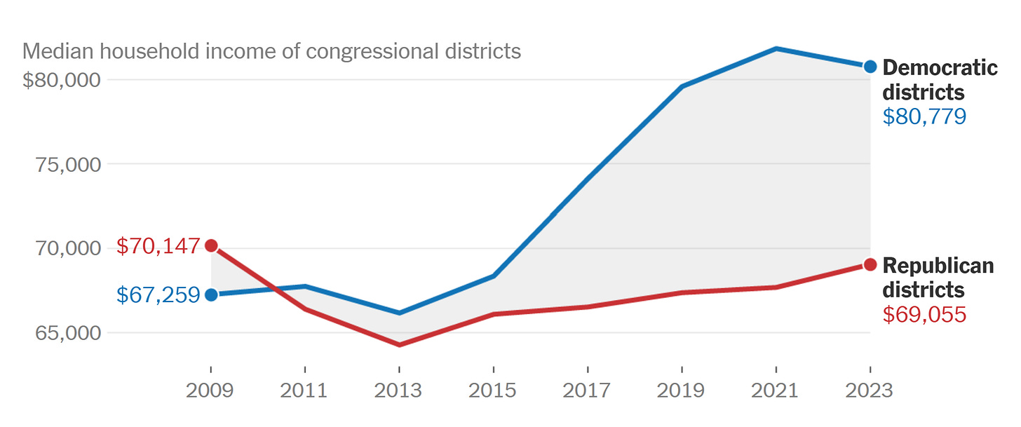 2. Democrats ❤️ the affluent! How can you reach the working class when your party is increasingly dependent on the votes of the affluent and naturally responsive to their priorities? That’s a tough one and Democrats aren’t anywhere close to figuring it out. Here are some charts from an excellent recent feature in the New York Times by Brody Mullins, starting with Congressional districts.