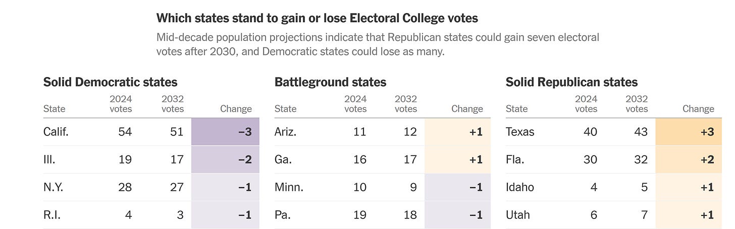 5. Population trends are making all of Democrats’ disadvantages worse. A recent study in the New York Times finds that population trends in this decade should subtract congressional seats from deep blue states and add them to deep red states. That in turn will tilt the all-important electoral college toward the Republicans, making attaining the presidency significantly more difficult for the Democrats. Here are a couple of charts from that study. First, the basic data: