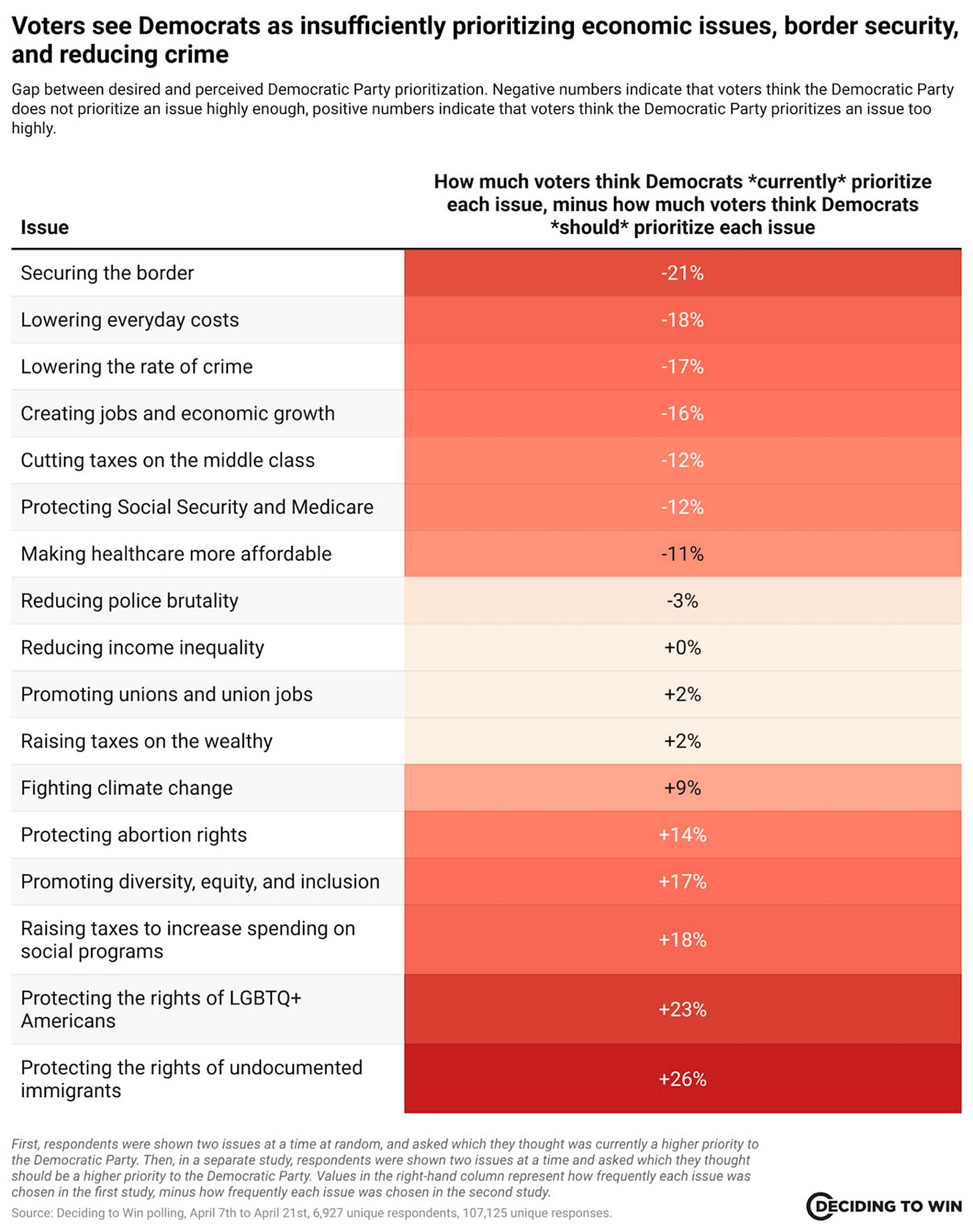 1. The Democrats’ image isn’t as bad as you think—it’s worse! The treasure trove of data in the new “Deciding to Win” report clarifies just how bad things are. Here’s a chart on what voters think Democrats do prioritize versus what voters think they should prioritize. At the top are issues Democrats vastly underprioritize (securing the border, lowering everyday costs, lowering the rate of crime, creating jobs and economic growth); at the bottom are issue Democrats vastly overprioritize (protecting the rights of undocumented immigrants, protecting the rights of LGBT+ Americans, raising taxes to increase spending on social programs, promoting DEI). Ouch.