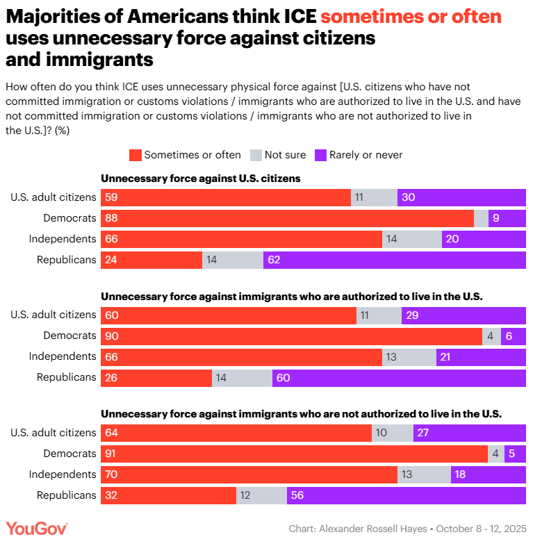 A November YouGov poll also found that a majority of Americans (52 percent), including 60 percent of independents, say ICE’s tactics are “too forceful” (compared to just 11 percent who argue they are not forceful enough and 26 percent who said they are “about right”). Even larger majorities believe ICE uses “unnecessary force” against U.S. citizens, immigrants authorized to live in the U.S., and even immigrants who are not authorized to live here.