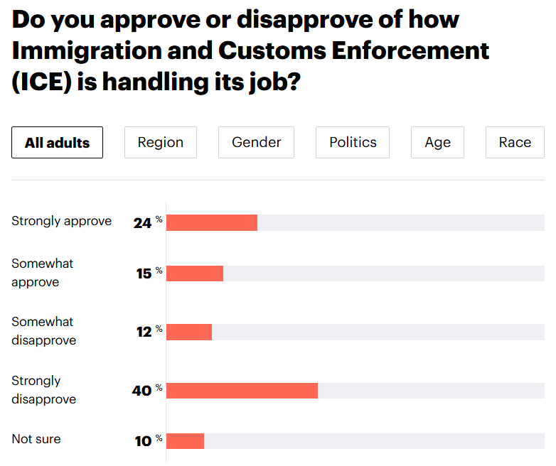 None of this means that Democrats can’t or shouldn’t talk about ICE and its actions. It is true that Americans’ disapproval of ICE is climbing: according to YouGov polling, the agency’s net approval was +16 as of last February, but today it sits at -13, with fully 40 percent of Americans now “strongly disapproving” of their job performance.