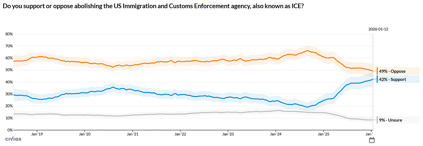 Some ICE agents have definitely been too aggressive, even illegal, in their interactions with civilians. But the reason that opinion polls show declining public support is that the non-conservative media - that’s almost the entire legacy media - have been completely one-sided in their coverage of ICE activities. ICE is always shown in negative ways, but there is rarely even slight mention of the thousands of violent criminals that ICE has apprehended. I live near Minneapolis and the recent ICE surge has resulted in ten convicted murderers and dozens of other violent criminals taken into custody. I’m not aware of any legacy media outlet disclosing that fact.