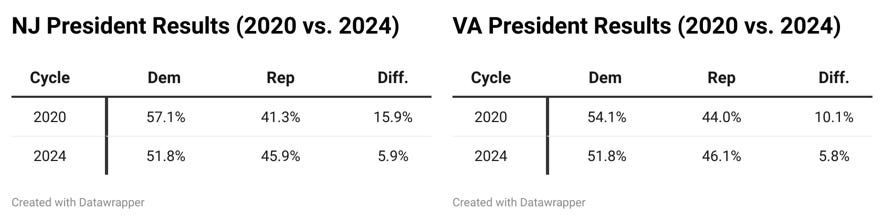 VA goes D. Sears-Earle made a career mistake in attacking Trump last year. She has tried to walk it back, unsuccessfully. The R wins the AG race. VA does not report voter reg by party. I assume it is following NC and NJ trends, but again, voter registration means a lot and the gap was more than 5 points in each. By 2028 this will be a much different story: depopulating DC's liberals through reductions; deportations, continued D-R shifts will all make both states a true tossup in 2028. For now, VA is a bridge too far.