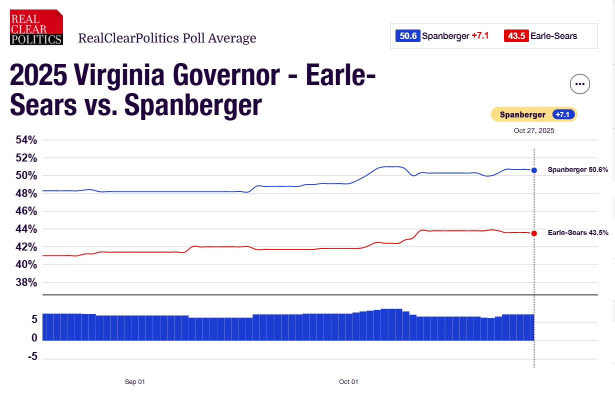 Heading into the final stretch of the campaign, Democrats appear to be in a stronger position in Virginia than in New Jersey. According to the RealClearPolitics average of polls, the Democrat in the race, former Congresswoman Abigail Spanberger, lead her GOP challenger, Lt. Governor Winsome Earle-Sears, by about seven points.