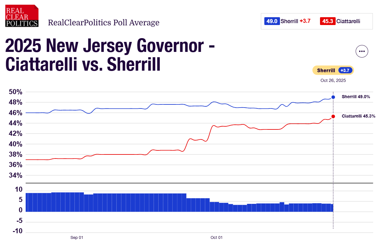When married together with historical election trends, this evidence adds to the idea that Spanberger and Sherrill are the favorites ahead of next week. However, Sherrill is arguably in a tougher fight, and there is a clear opening for Ciattarelli to upset historical trends and become New Jersey’s first Republican governor since Chris Christie.
