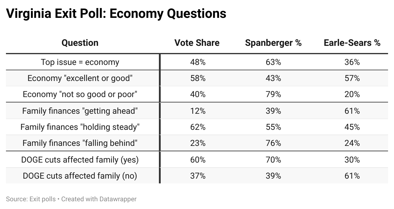 In New Jersey, Virginia, and New York City, a plurality or majority of the electorate said the number one issue facing their state or city was the cost of living, and these voters broke overwhelmingly for the winning candidate. This was especially evident in Virginia, where nearly half (48 percent) of voters highlighted the economy as the number one issue—and they backed Democrat Abigail Spanberger over Republican Winsome Earle-Sears, 63 to 36 percent. She also carried voters who said that the economy was “not so good or poor,” those who said they were either “holding steady” or “falling behind” financially, and Virginians who reported that their family finances suffered due to the Trump administration’s DOGE cuts.
