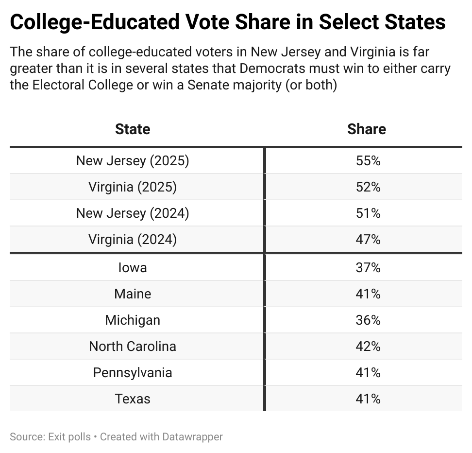Additionally, both electorates were highly educated and affluent. In New Jersey, fully 55 percent of voters had a college degree against 45 percent who did not, while in Virginia that gap was 52 to 48. Not only did college degree-holders make up greater shares of the vote in each state than they did last year, but they constitute much larger shares there than they do in presidential swing states and others they’ll need to win for a chance at a Senate majority. Here is what the share of college-educated voters looks like in a few such states (per the 2024 results):
