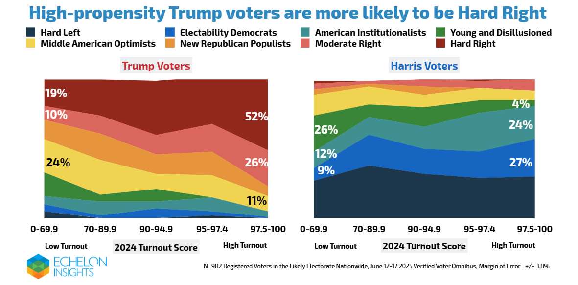 Things have also changed since then. In just the last midterm election, loyal MAGA voters were among the highest-propensity voters. According to a recent study by the polling firm Echelon Insights, among all Trump voters, the “Hard Right” constituted an outright majority (52 percent) of those who were likeliest to vote—twice the size of the next group and far larger than any group of Harris voters.