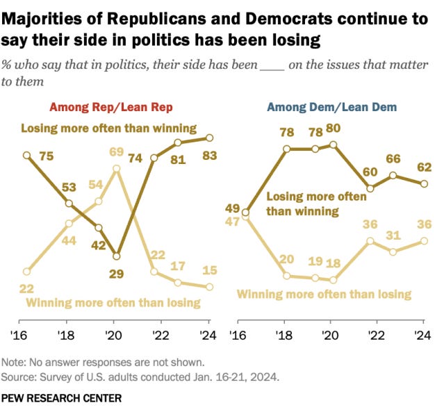 Compounding all this is a perception held by a giant majority of partisans that their side is losing more than it is winning, a concern that has increased substantially over the past decade and appears to be especially strong among whichever party does not control the presidency.