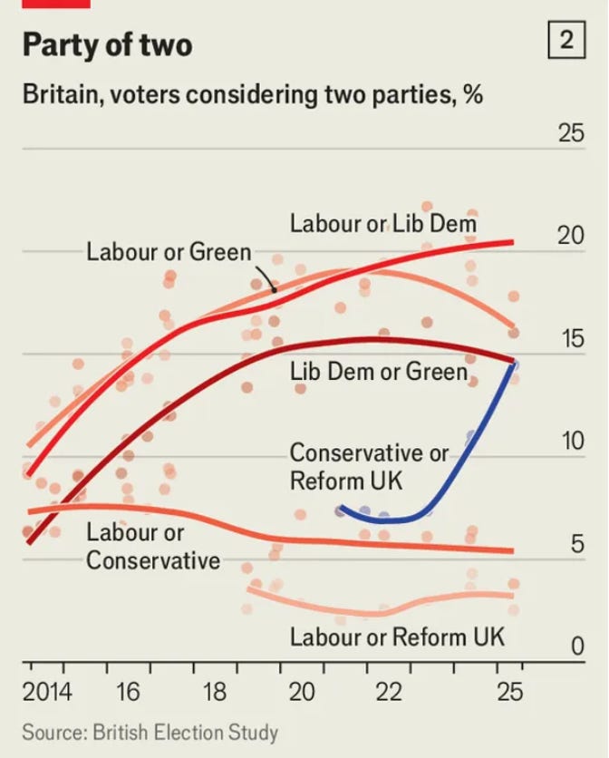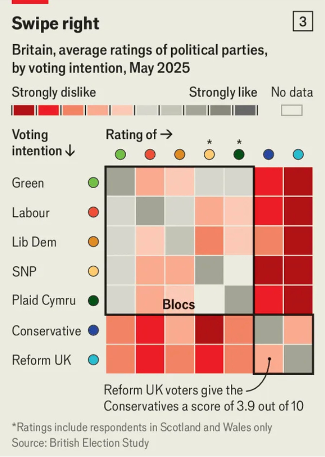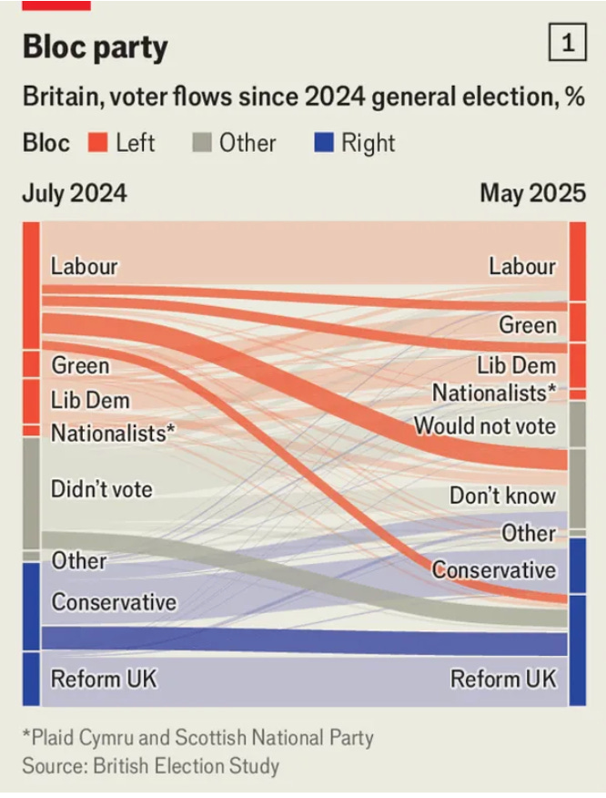 🇬🇧 “The new battle for Britain: Once elections were fought between left and right. Now the main fight is within these camps,” from The Economist. The crack data team at The Economist presents fascinating work on the voter shifts that continue to roil British politics after Labour’s landslide victory in 2024: