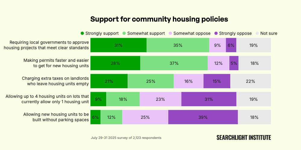 🏡 “What Americans Think About Housing,” by Searchlight Institute. TLP friends at the newly launched think tank focused on “supermajority” thinking for Democrats offer interesting new data on America’s housing crisis. What changes to housing policy do Americans currently support?