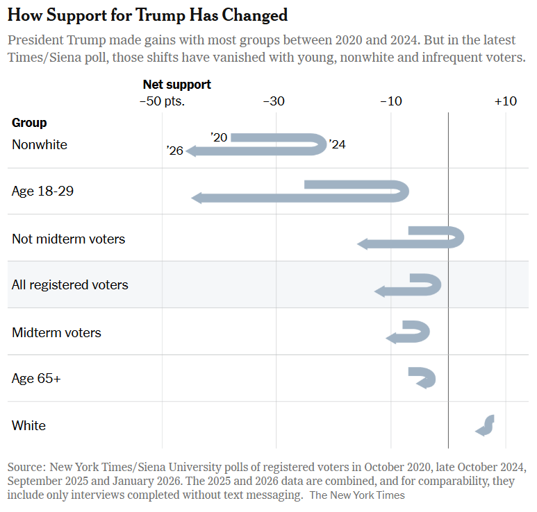 Last month, at the one-year anniversary of Donald Trump’s inauguration, New York Times political analyst Nate Cohn took a look at the state of the president’s 2024 coalition. According to his data, many of the voters who helped make Trump president for a second time have swung hard against him over the past year, including, notably, racial minorities and young voters. Both groups have historically voted heavily Democratic, but Trump made significant gains with them in 2024. Now, however, both support him at lower rates than they did not just in 2024 but in 2020 as well.